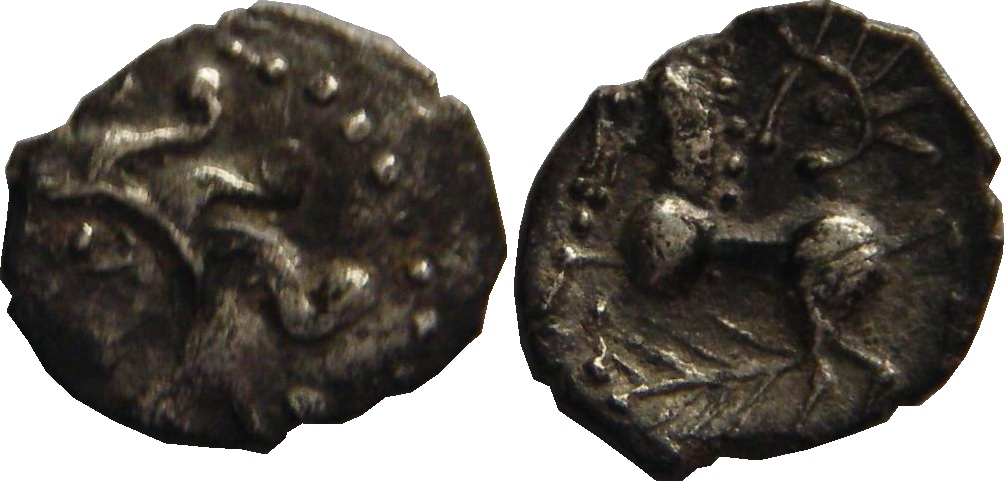 DT 3706 et variantes. D/ Tête à gauche dans un grènetis ; la chevelure à grosses mèches enroulées aux extrémités et formant des S. R/ Cheval bondissant à droite dans un grènetis bien marqué. Datation : c. 220-190 av. J-C. |