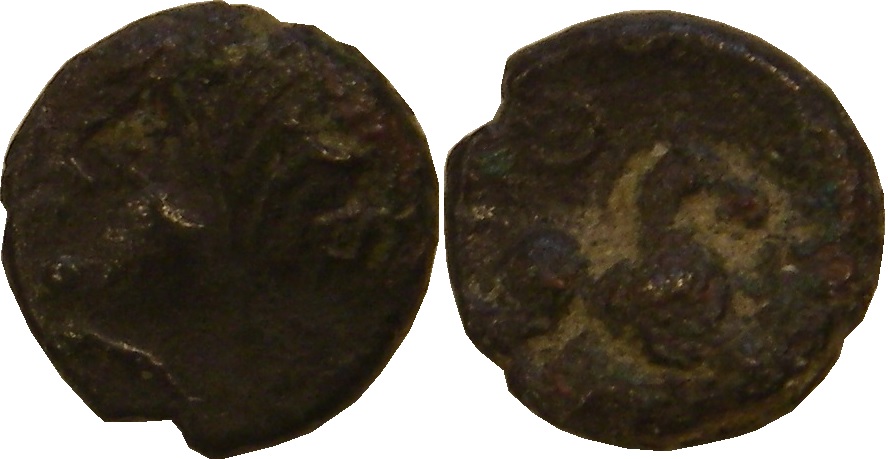 DT 3701 ; BN 3849, 51-53 et 4311E-F ; Nash 626-30 ; NC III, 104. D/ Profil à gauche avec ce qui semble être un casque strié ; le nez, la bouche et le menton peuvent parfois se limiter à plusieurs globules superposés. R/ Cheval galopant à gauche entre deux annelets non pointés. Datation : 50-30 av. J.-C. ? |