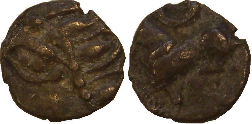 ![]() b) Type avec la tête à droite. DT 3706 ; BN 4311A-B ; Nash 149 ; NC IV, 133. 10 exemplaires : 0,34-0,55 g (moy. 0,42 g) / 9 mm. Provenance : Lacoste (1 ex.), littoral charentais, Limousin. |