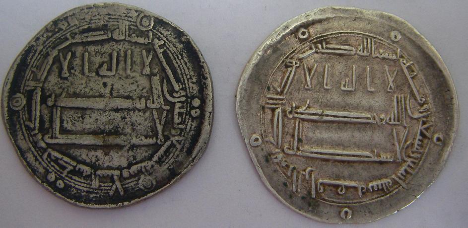 l'original du dirham abbasside de Haroun al-Rachid à droite. Les